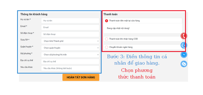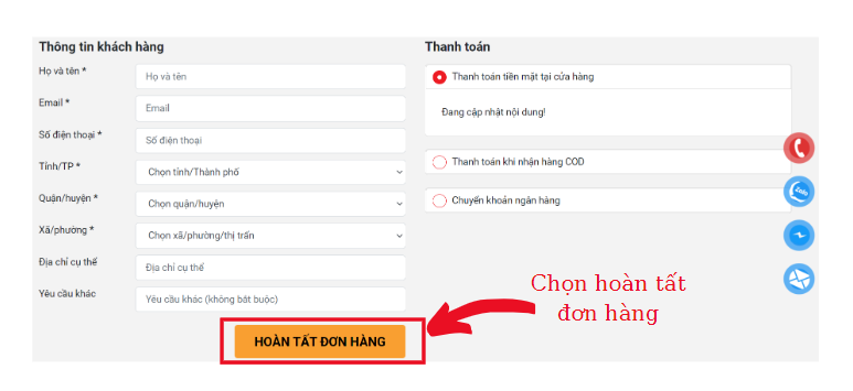 - Điền thông tin khách hàng bao gồm: Tên, email, số điện thoại, địa chỉ, yêu cầu (nếu có)