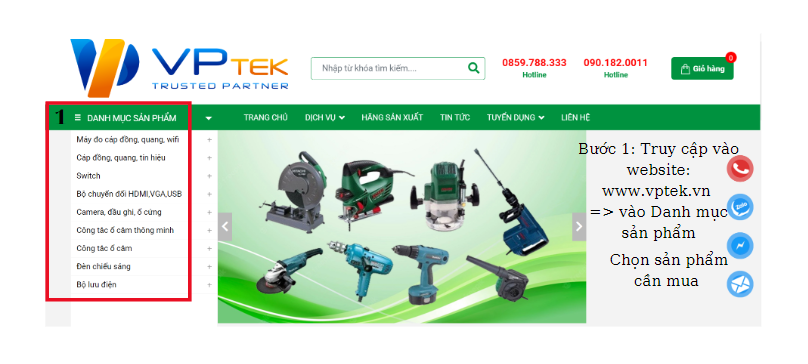 Bước 1: Mở Trình duyệt trên thiết bị di động/máy tính cá nhân (Chrome, Cốc Cốc, Samsung Internet). Sau đó truy cập vào website: www.vptek.vn, lựa chọn DANH MỤC SẢN PHẨM